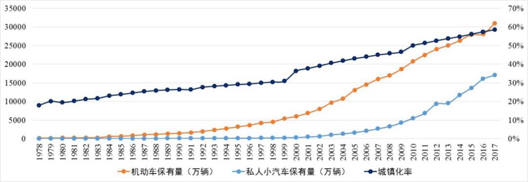 图1:1978年~2017年我国城镇化率、机动化发展变化曲线
